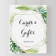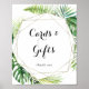 Cette enseigne de cartes et cadeaux de destination géométrique est parfaite pour un mariage tropical ou une fête de mariage. Le design présente des feuilles de palmier vert et de bananier peintes à l'aquarelle et peintes à la main, soigneusement disposées en de beaux bouquets, ornant un cadre géométrique doré.