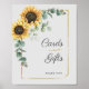Notre enseigne de cartes et de cadeaux à cadre floral et géométrique au tournesol et à l'eucalyptus est parfaite pour un mariage champêtre dans une grange ou une douche de mariée. Le design floral bohème présente des tournesols jaunes, des feuilles géométriques et un cadre en feuille d'or, ainsi que de la verdure d'eucalyptus de couleur vert chasseur en aquarelle avec un look rustique moderne élégant.