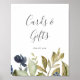 Ce panneau de cartes et cadeaux de verdure d'automne est parfait pour un mariage d'automne ou une fête de mariage. Le design rustique moderne présente des feuilles de couleur bleu marine, vert sauge et or avec des brindilles de fleurs bleu foncé. La ligne de texte au bas du panneau peut être personnalisée avec la date, les noms des mariés ou un court message comme "Merci". Ce panneau peut être utilisé pour un mariage ou tout événement ou fête.