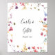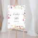 Ce panneau classique de cartes et cadeaux de fleurs sauvages colorées est parfait pour un mariage rustique ou une fête de mariage. Le design présente des fleurs sauvages jaunes, violettes et blanches avec du feuillage sur un fond de peinture à l'eau rose et vert.