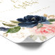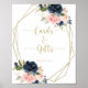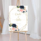 Ce panneau à motif géométrique et fleurs dorées est parfait pour un mariage rustique ou une fête de fiançailles. Le design simple et élégant présente une typographie classique et élégante en or. Le design présente de belles fleurs peintes à la main en bleu foncé, bleu, marine, rose, rose pâle, or et feuillage vert, ornant un cadre géométrique.