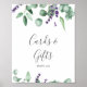 Ce panneau de cartes et de cadeaux à la lavande et à l'eucalyptus rustiques est parfait pour un mariage en plein air ou une fête de mariage simple et élégant. Le design floral présente des feuilles d'eucalyptus et de la verdure à l'aquarelle avec des brins de fleurs sauvages violettes. La ligne de texte au bas du panneau peut être personnalisée avec la date, les noms de la mariée et du marié, ou un court message comme "Merci". Ce panneau peut être utilisé pour un mariage ou tout événement ou fête.