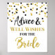 Panneau de conseils et de vœux pour la mariée pour une douche de mariage dans un motif de confettis noir et or.