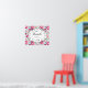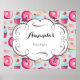 Un poster avec une affiche de cuisine personnalisée avec votre nom. Pourrait également remplacer la cuisine pour dire boulangerie ou bonbons magasin etc... Placé sur un cadre de style français et décoratif soigné. Illustré avec des beignets rose vernis avec des arroses. Serviettes d'arrosage à la bouche en rose et bleu avec rosettes et fraises sur le dessus. Des macarons de pâtisserie rose pastel et de petits boutons de bonbon de bonbon de bonbons de bonbons roses décorent également ce motif plein de douceurs.