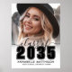 Une carte d'annonce de remise de diplômes horizontale classique et moderne avec un look intemporel en noir et blanc. Le recto présente un « Promotion de » en gros caractères associé à « 2025 » en lettres noires grasses pour une déclaration forte et élégante. Des accents de script subtils ajoutent une touche de douceur, tandis que deux icônes de chapeau de diplômé apportent une atmosphère de célébration. En dessous, il y a de la place pour le nom du diplômé et de l'école, ce qui maintient la mise en page équilibrée et facile à lire.