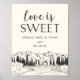 Les clients Invitations pourront déguster des bonbons avec notre charmante enseigne de table à dessert mariage rustique. 11x14 panneau de table dessert dispose d'une bordure inférieure de sommets dessinés à la main, de pins et d'une rivière qui coule, avec "l'amour est doux, s'il vous plaît prenez un plaisir" en haut. Personnalisez avec votre date de mariage sous l'inscription, et montez et présentez à votre bar de dessert mariage !