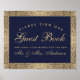 Un panneau de mariage alphabétique élégant et vintage, recommandé pour un mariage avec des couleurs de mariage bleu marine et or. Le fond est bleu marine. Il comporte des bordures dorées florales avec des décorations complexes de roses sauvages. Tout le texte est doré. Les mots Livre d'or et les noms sont écrits dans un script calligraphique élégant, le reste en majuscules. Le message "veuillez signer notre" est arqué au-dessus des mots "Livre d'or". Les décorations de roses dorées proviennent d'une couverture de livre vintage de 1912, de Les Œuvres Poétiques Complètes de Geoffrey Chaucer, maintenant dans le domaine public.