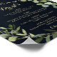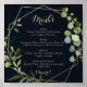 Ce panneau de menu de boissons de mariage bleu vert or géométrique est parfait pour un mariage simple. Le design présente de belles feuilles vertes peintes à la main sur un fond bleu foncé, ornant un cadre géométrique doré.