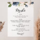 Ce panneau de menu de boissons de mariage floral élégant d'hiver est parfait pour un mariage moderne. Le design présente de belles fleurs peintes à la main en bleu foncé, bleu, marine, rose, blush, or et feuillage vert, regroupées en bouquets élégants.