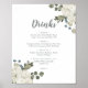 Ce panneau de menu de boissons de mariage floral hivernal est parfait pour un mariage élégant. Le design simple présente des fleurs blanches avec de la verdure hivernale et des feuilles d'eucalyptus, avec une ambiance champêtre moderne.