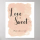 Ce panneau de table de dessert de mariage, avec son fond d'aquarelle rose blush et son écriture calligraphique et en italique, est une belle façon de décorer la table des douceurs lors du mariage.