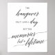 Cette affiche élégante en calligraphie noire pour gueule de bois et souvenirs est parfaite pour un mariage simple. Le panneau indique "la gueule de bois ne dure qu'un jour mais les souvenirs durent toute une vie". Le design neutre présente une affiche minimaliste décorée d'une typographie romantique et fantaisiste.