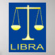 Cette affiche impressionnante présente l'image art numérique d'une paire d'écailles de pesée de couleur dorée avec le mot Libra en dessous dans le texte en or. Un design amusant pour les gens célébrant un anniversaire né entre le 23 septembre et le 22 octobre sous le signe étoilé de Libra.