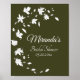 Joli et moderne panneau de douche nuptiale design dispose d'un spray de fleurs blanches et blanc personnalisable texte sur l'arrière - plan vert d'automne. Monter ou encadrer pour un bel affichage de table.