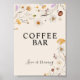 Panneau de bar à café, caractérisé par un style boho avec des oeuvres d'art florales et des couleurs terreuses et beiges neutres.