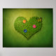 Belle illustration romantique : pelouse en forme de coeur avec fleurs et papillon sur un arrière - plan grungy vert.