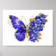 Bijoux, bleu, saphir, papillon aux fleurs pétillantes avec aile décorée de bleu, fleurs précieuses avec feuilles d'or sur arrière - plan blanc.