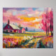 Un tableau abstrait moderne et vibrant d'une ferme en automne, avec des teintes chaudes d'orange, rose et or avec des touches abstraites expressives. La composition dynamique saisit la beauté de l'automne, évoquant la sérénité d'une scène rurale. Les couleurs vives et le brossage fluide créent un sens du mouvement et de l'énergie, donnant à cette pièce une touche contemporaine sur un paysage rural classique.