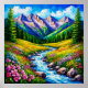 Paysage alpin coloré avec un ruisseau, des fleurs sauvages luxuriants et des montagnes majestueuses sous un ciel bleu vif. Une représentation sereine et pittoresque de la beauté et de la tranquillité de la nature.