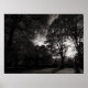 Une photo chaude tonique en noir et blanc prise au milieu des arbres à Bute Park Cardiff lors d'un après-midi ensoleillé de novembre, le soleil d'automne bas dans le ciel brille à travers les arbres jetant de longues ombres et des silhouettes spectaculaires.