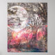 Une pleine lune descend au-dessus d'un étang sombre dans une forêt dormante, avec un coucher de soleil rose vif à l'horizon.