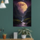 Cette affiche enchanteresse capture un moment à couper le souffle sous le ciel nocturne, où une magnifique lune dorée prend le centre de la scène, projetant son éclat lumineux sur un paysage montagneux serein. La lune, incroyablement grande et rayonnant une lumière douce et dorée, semble contenir des secrets de l'univers dans son éclat, éclairant la scène avec une aura mystique. En bas, un doux ruisseau traverse le terrain accidenté de la montagne, reflétant la lumière éthérée de la lune et rehaussant l'atmosphère magique de la scène. Le ciel, peint dans des nuances profondes de violet, ajoute une couche de mystique et d'émerveillement, créant un équilibre harmonieux entre le céleste et le terrestre. Cette affiche n'est pas seulement un objet d'art, c'est une porte vers un endroit calme et insolite où la beauté de la nature est en parfaite harmonie avec le cosmos.