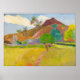 Paul Gauguin. Paysage tahitien. Bel paysage aux couleurs chaudes. Un homme traverse le champ en portant son fardeau. Il y a de hautes montagnes dans l'arrière - plan. Des nuages blancs traversent le ciel bleu. Reproduction d'oeuvres d'art célèbres dans le domaine public.