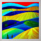 Un paysage abstrait de collines ondulées aux couleurs vives et aux lignes angulaires.