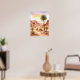 Affiche illustrant un paysage désertique serein présentant des dunes de sable doré et des formations rocheuses sous un ciel pastel, avec des palmiers luxuriants disséminés un peu partout. Les couleurs douces et chaudes évoquent un sentiment de tranquillité et de beauté naturelle.