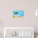 Une affiche graphique illustrant une plage de sable, un ciel bleu, des nuages et un palmier aux feuilles verts et peu de noix de coco. Cet art mural sera parfait pour la maison, la décoration de bureau, ou pour se souvenir de vos vacances. Vous pouvez laisser le texte en blanc, si vous préférez!