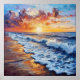 Paysage marin vibrant au coucher du soleil, caractérisé par des couleurs et des textures dramatiques. Le ciel est rempli de nuages dynamiques qui passent de teintes profondes de pourpre et d'orange à des bleus doux, créant un arrière-plan saisissant pour le soleil couchant. Le soleil lui-même jette une lueur chaude et dorée sur l'horizon, reflétant des nuances d'orange et de rose sur l'eau.