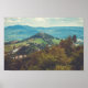 Poster avec une photo de style vintage. Paysage d'été romantique : vieille église sur la colline, petit village dans la vallée de la montagne, forêt au premier plan, montagnes dans l'arrière - plan. Grand cadeau pour les amateurs de voyage et de plein air. Ajout élégant à l'intérieur sur le thème du voyage.
