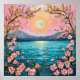 Paysage serein rehaussé par des couleurs vives et des détails complexes. Au centre, une pleine lune brille doucement sur un ciel pastel, passant du rose au pêche. De part et d'autre de la lune se trouvent des montagnes lointaines, ajoutant de la profondeur à la scène.