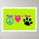 Graphique mignon en couleurs néons colorées. 3 symboles - un signe de paix, un coeur et une patte, avec les mots paix, amour et pattes. Pour les propriétaires d'animaux de compagnie qui aiment la paix.