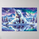 Un ours polaire mère est debout avec ses trois petits sur un rivage enneigé. Des montagnes enneigées s'élèvent dans l'arrière - plan sous un ciel nocturne rempli d'aurores boréales. Au premier plan, deux petits oiseaux se tiennent sur le rivage enneigé, et la scène se reflète dans l'eau. La neige tombe légèrement.