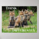 Quatre renardeaux rouges sont représentés avec trois regardant ailleurs et le quatrième fixant directement le spectateur.