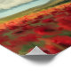 Reproduction d'aquarelle vive à partir d'une aquarelle originale. Champ de pavot et arc-en-ciel avec grand nuage de pluie blanc et bouffant. Les fleurs rouges, jaunes et orangées s'estompent au loin des collines vertes et des arbres. Le ciel bleu se jette en haut. Egalement disponible sur toile.