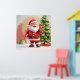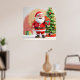 Père Noël tenant joyeusement un cadeau et entouré d'un arbre de Noël décoré. La scène festive illustre la célébration, la joie et l'esprit des fêtes.