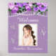 Belle Quinceañera 15ème anniversaire de fête "Welcome" affiche avec un élégant vintage violet fleuri et à cordes clair et papillon arrière - plan. Personnalisez en ajoutant une photo et le nom du célébrant au cadre de perle classe.
