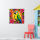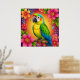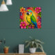 Un perroquet coloré au plumage vif est assis sur une branche, accompagné de fleurs tropicales lumineuses sur un fond bleu serein, créant un thème tropical vibrant et animé.