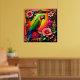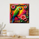 Un perroquet coloré au plumage éclatant est perché sur une branche, accompagné de fleurs tropicales lumineuses sur un fond bleu serein, créant un thème tropical vibrant et animé.