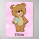 Affiche adorable et personnalisée pour la chambre de bébé ou la chambre d'enfant avec un fond personnalisable rose bébé et un ours en peluche tenant un hochet. Personnalisez la couleur de fond, le nom ou ajoutez votre propre texte. Cette affiche est un excellent ajout à la chambre de votre enfant ! Tous nos produits peuvent être conçus sur mesure pour répondre à vos besoins sans frais supplémentaires. Contactez-nous simplement via notre magasin. Produits coordonnés disponibles : demandez-nous !
