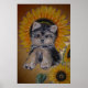 Petit chien mignon et adorable avec des tournesols sur un arrière - plan doré foncé. Obtenez ce joli yorkie et une Bonne Année du Chien!