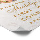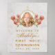 Ce design religieux géométrique floral élégant comporte une photo de fille remplaçable dans un cadre doré irrégulier formé de deux hexagones superposés, avec une croix dorée en haut et des fleurs de magnolia rose à gauche et à droite. Le texte en dessous est doré. Le nom est écrit dans un script calligraphique élégant, le reste en majuscules. Le fond est en marbre blanc.