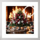 Un centre de Noël festif occupe la scène, orné de verdure luxuriante, de rouge et d'argent vibrants et de bougies. La chaleur d'une cheminée crépitant dans l'arrière - plan ajoute à l'ambiance cosy des vacances.
