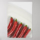 Vue en grand angle de cinq piments rouges dans une assiette. Copyright : Glowimages