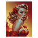 Immergez-vous dans l’élégance intemporelle des années dorées avec cette affiche vintage somptueuse, parfaite pour les amateurs de glamour rétro. Une pin-up blonde captivante, aux cheveux soigneusement coiffés en vagues volumineuses et relevés dans un chignon classique, est sublimée par des roses rouges éclatantes et des feuilles vertes délicates, glissées dans sa chevelure comme un hommage à la féminité et à la passion. Elle porte un haut en satin rouge profond, dont le décolleté plongeant est orné d’une fleur assortie, ajoutant une touche de sophistication et de sensualité à son allure. Le fond, un dégradé chaleureux passant d’un orange doré à un rouge intense, évoque la lumière d’un coucher de soleil, enveloppant la scène d’une aura lumineuse et luxueuse. Des ombres subtiles et une silhouette floue en arrière-plan, suggérant peut-être un éventail ou une plume, renforcent l’atmosphère dramatique et élégante de l’œuvre. Cette affiche incarne l’essence du style pin-up classique, mêlant romantisme et raffinement, et constitue une pièce incontournable pour tout collectionneur d’art vintage.