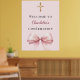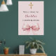 A large pink bow and a golden cross as decoration. A soft, blush pink background. Personalize and add her name.