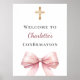 A large pink bow and a golden cross as decoration. Personalize and add her name.
