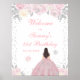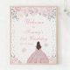 Ce panneau de bienvenue élégant et glamour pour la fête d'anniversaire d'hiver présente une belle princesse aux cheveux brunes et à la peau claire dans une robe de boule rose. Le texte combine écriture manuscrite et polices sans serif modernes pour un look élégant et sophistiqué. Les compositions florales, les flocons de neige et les confettis argentés créent un mélange parfait de rustique et de chic. Graphiques par www.etsy.com/uk/shop/SunflowerDayLove
